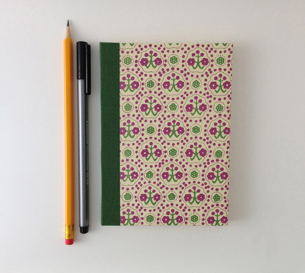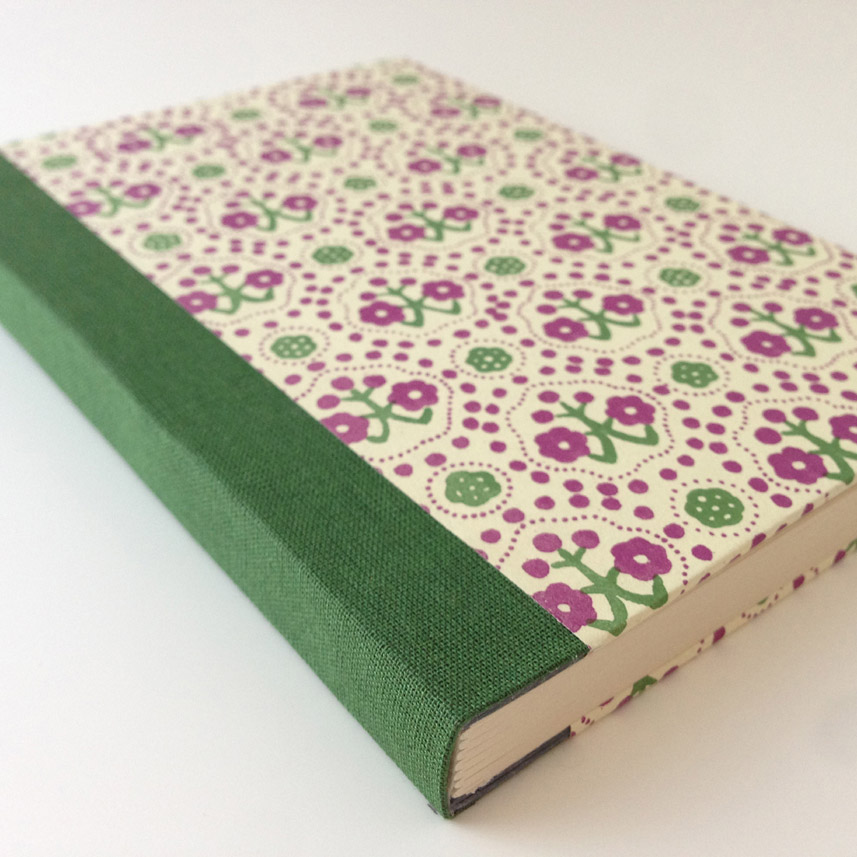 Hand-bound notebook with decorative paper sides and cloth spine.