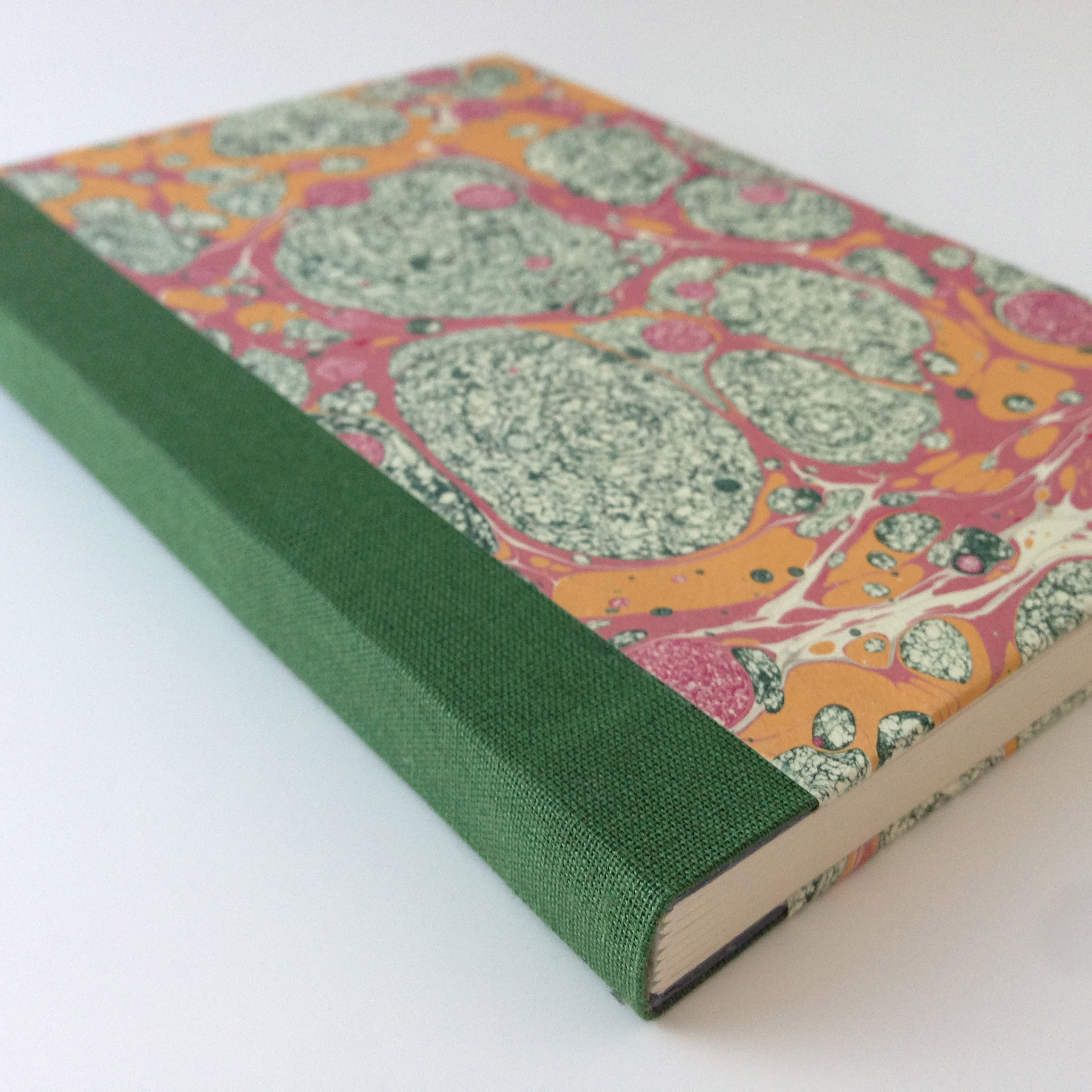 - Bound with marbled paper and coordinating cloth spine.