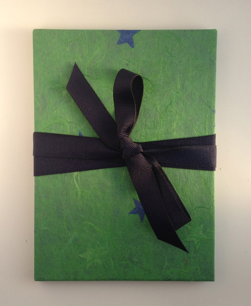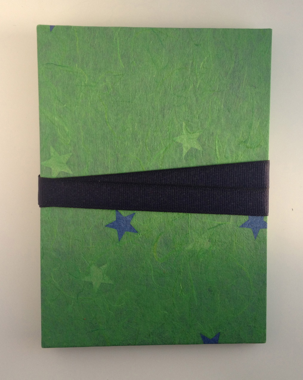 • Covered with a two-sided handmade green and blue paper with star cut-outs.