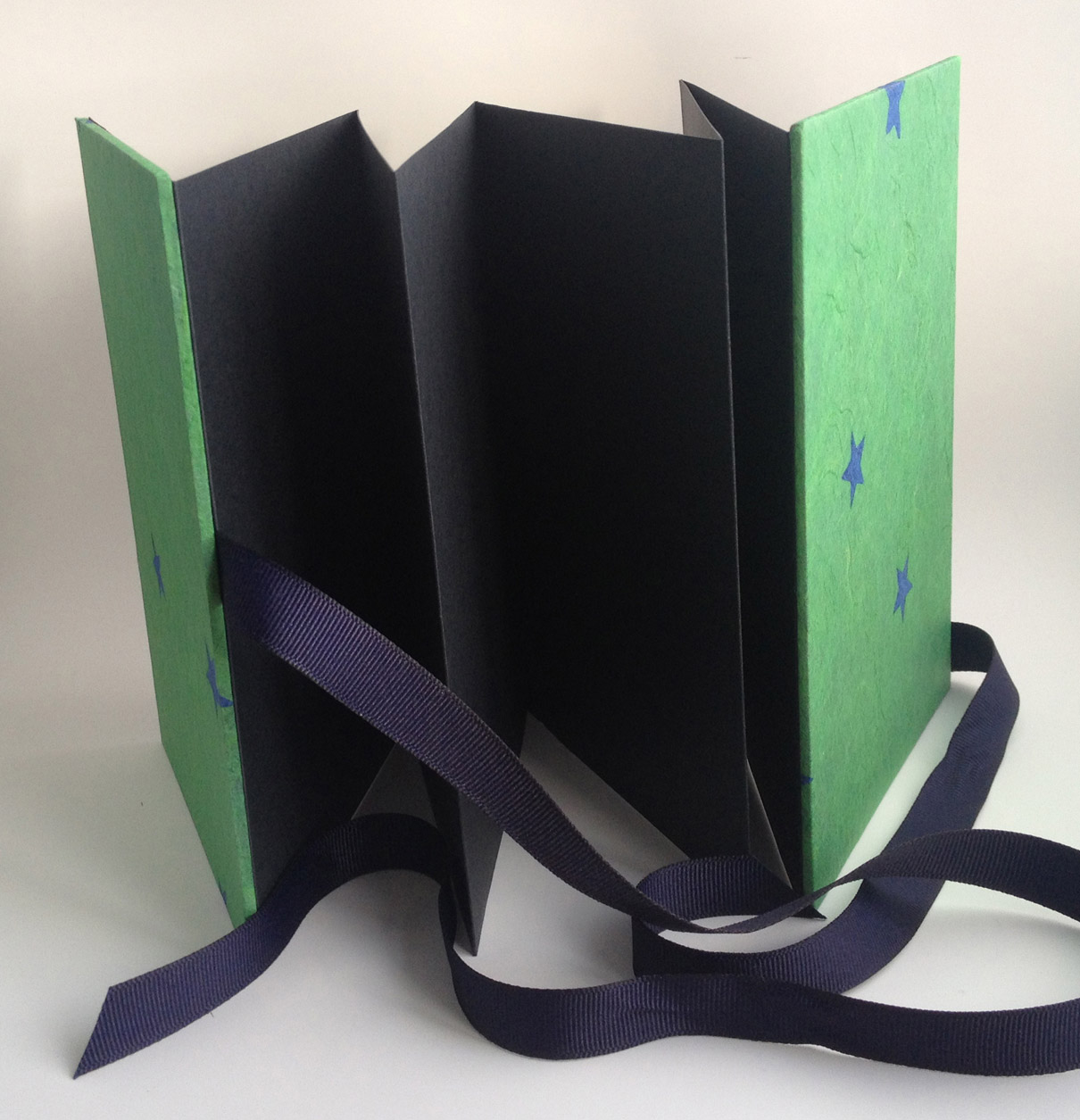 • Hand-bound with one 7” x 40” (178mm x 1m) piece of ivory/black acid-free card that is scored and folded to make 8-pages (14 if you use both sides) and two pieces of 2.8mm thick acid-free millboard.